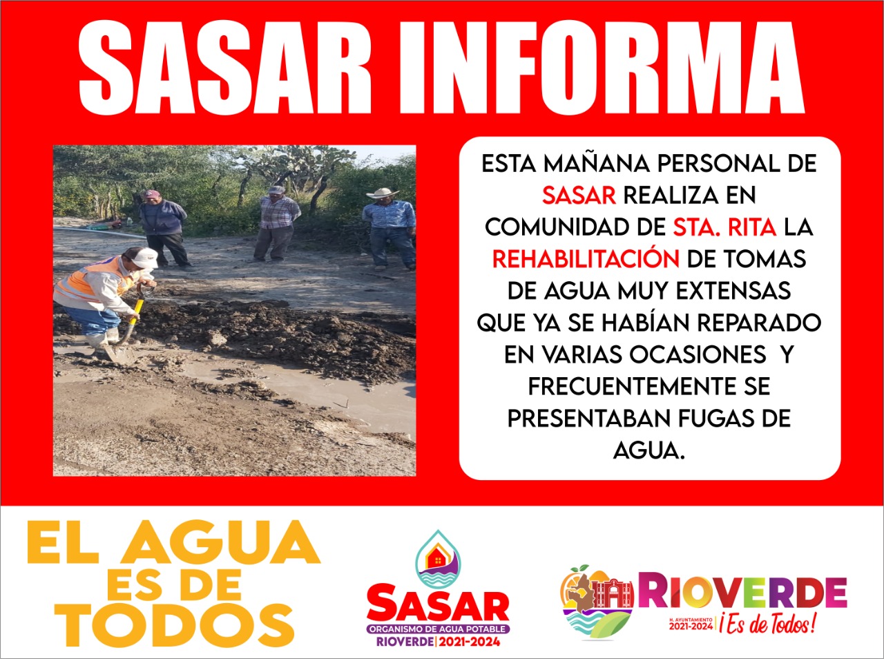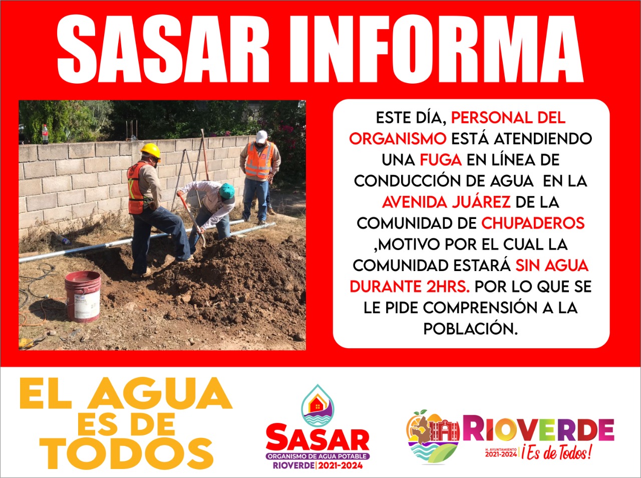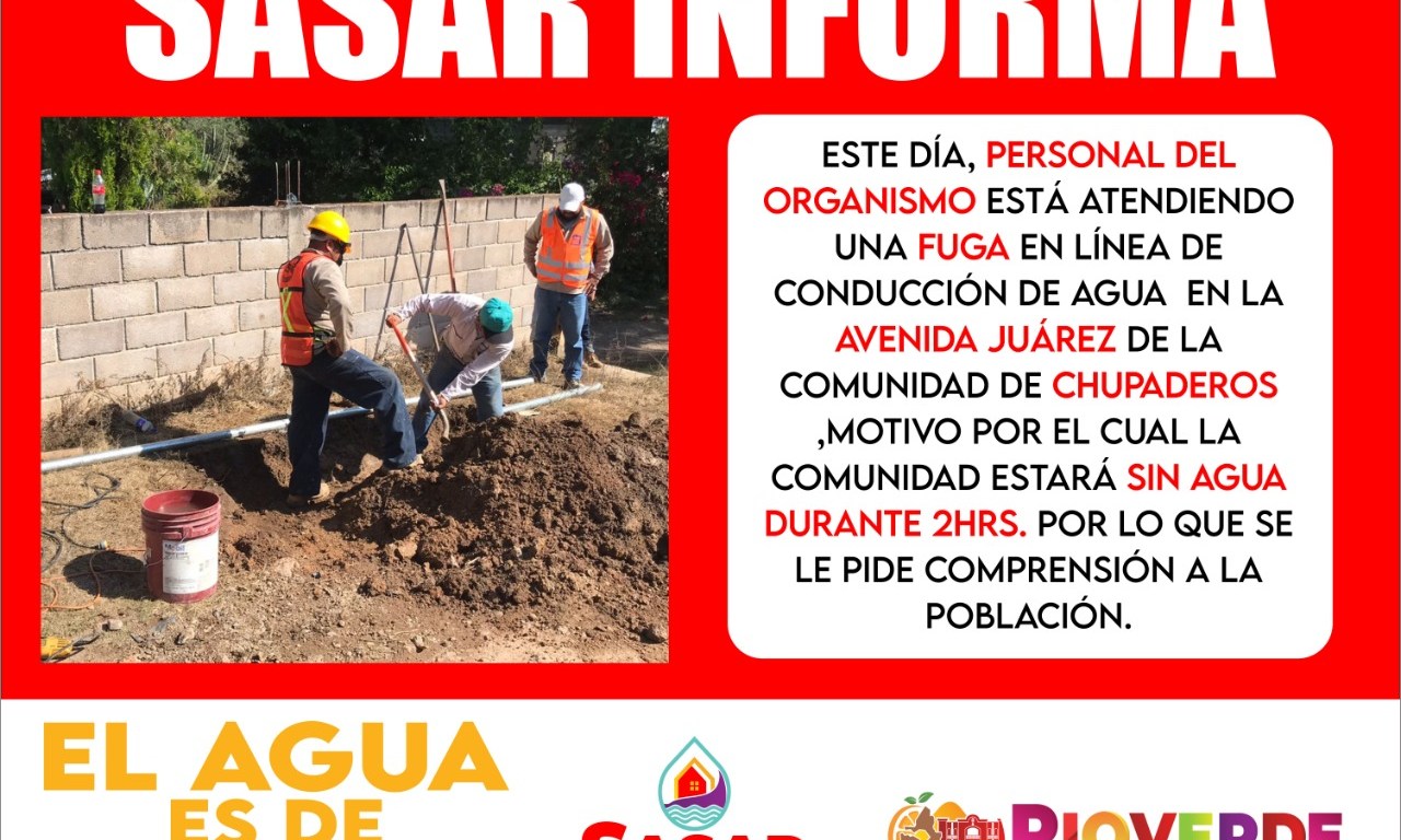 SASAR INFORMA. Que este día Personal del organismo está atendiendo una fuga en línea de conducción de agua en la avenida Juarez de la comunidad de Chupaderos ,