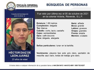 Estando próximo a cumplirse dos meses desde su reporte de desaparición en el municipio de Rioverde, continúa la búsqueda del joven Héctor Díaz de León Juárez, de 23 años de edad, a quien no se localiza desde el pasado día 05 de octubre del presente año del 2021.