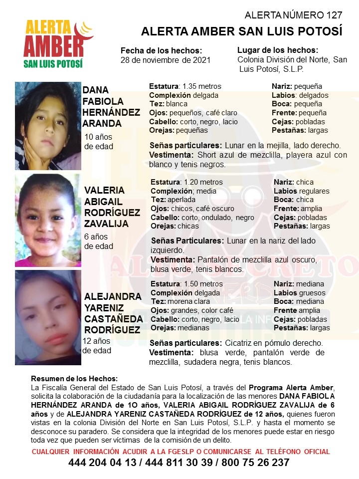 SLP. – La Fiscalía General del Estado de San Luis Potosí (FGESLP), activó una Alerta Amber para la localización de Dana Fabiola Hernández Aranda de 10 años, Valeria Abigail Rodríguez Zavalija de 6 años y Alejandra Yareniz Castañeda Rodríguez de 12 años, quienes fueron vistas por última vez en la colonia División del Norte, perteneciente al municipio de San Luis Potosí.