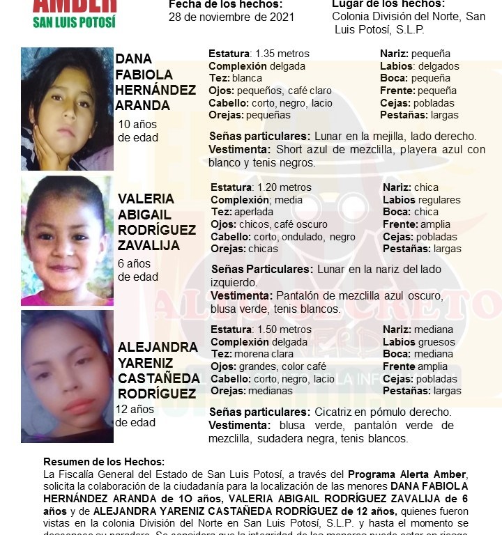 SLP. – La Fiscalía General del Estado de San Luis Potosí (FGESLP), activó una Alerta Amber para la localización de Dana Fabiola Hernández Aranda de 10 años, Valeria Abigail Rodríguez Zavalija de 6 años y Alejandra Yareniz Castañeda Rodríguez de 12 años, quienes fueron vistas por última vez en la colonia División del Norte, perteneciente al municipio de San Luis Potosí.