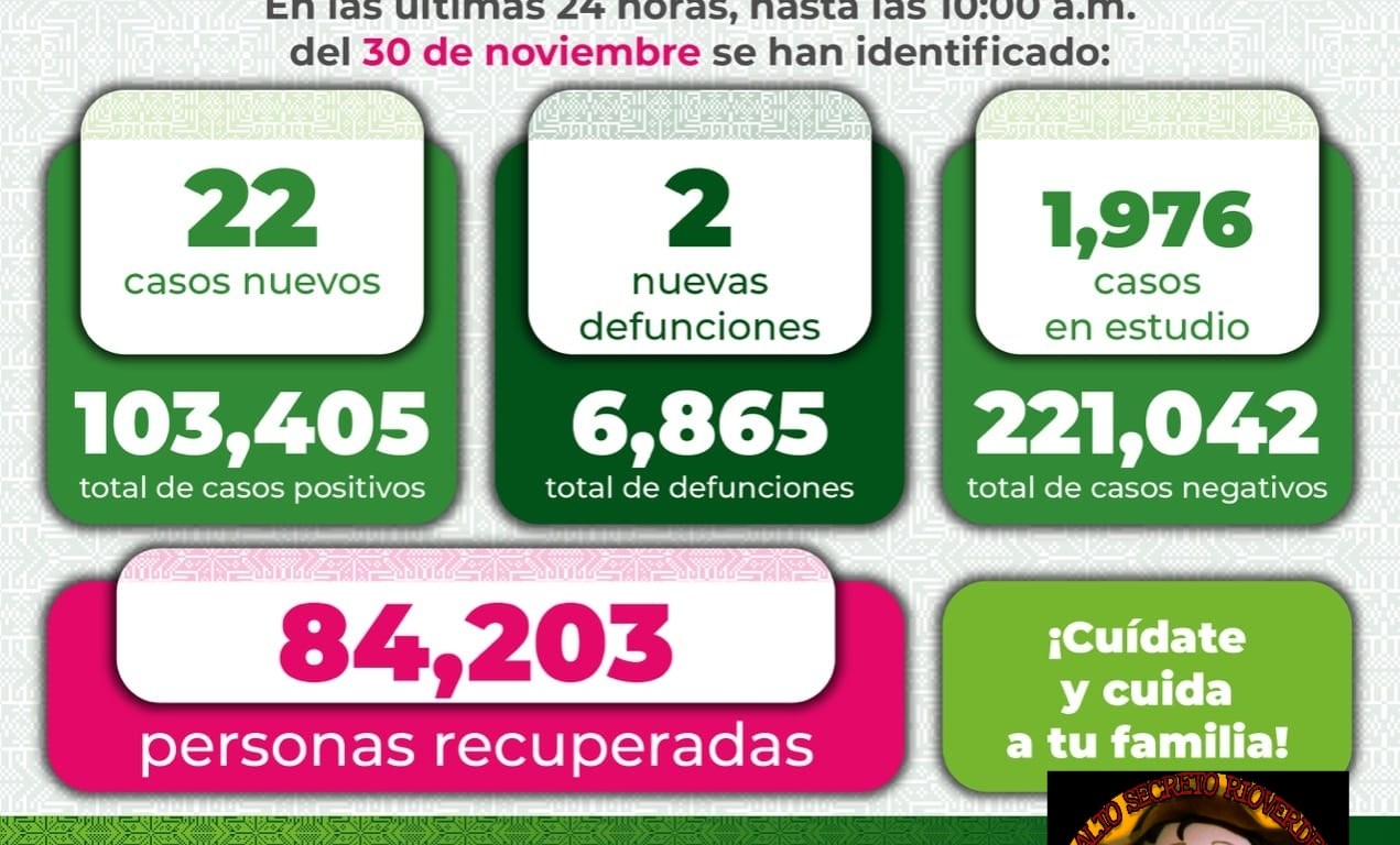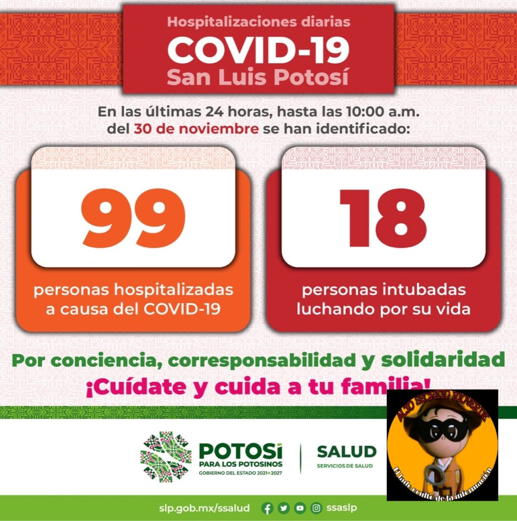 La Secretaría de Salud de San Luis Potosí y el Comité Estatal para la Seguridad en Salud, informa que hasta este martes 30 de noviembre, se registran 103 mil 405 casos totales de Covid-19, con la confirmación de 22 nuevos contagios en las últimas 24 horas.