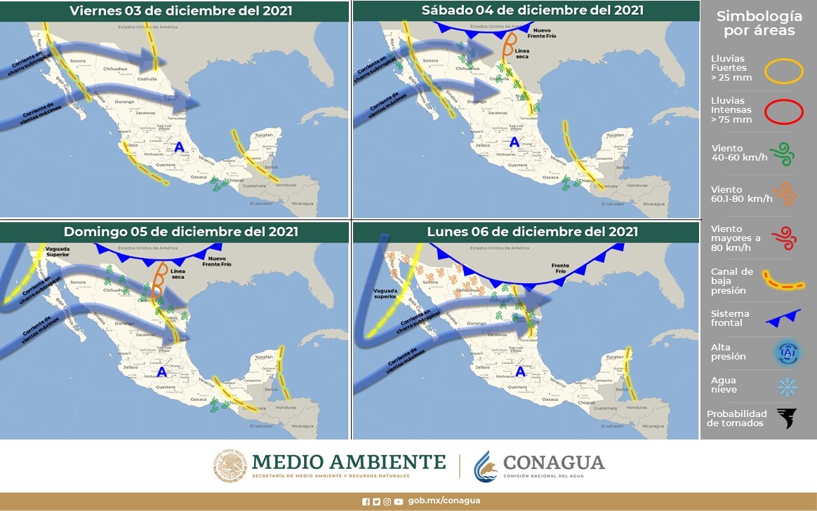 A partir del lunes una vaguada superior ocasionará vientos fuertes, lluvias y chubascos dispersos sobre entidades del noroeste del país.