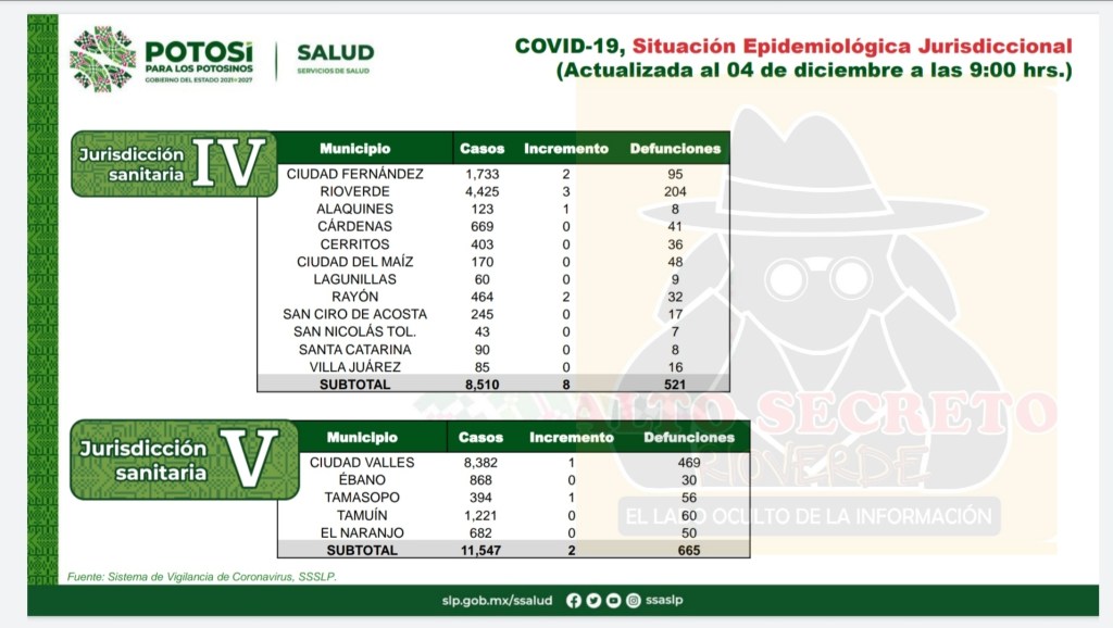 El Municipio de Rioverde acumula 4,425 casos positivos y 204 fallecimiento, mientras que Ciudad Fernández suma 1,733 casos y 95 decesos.