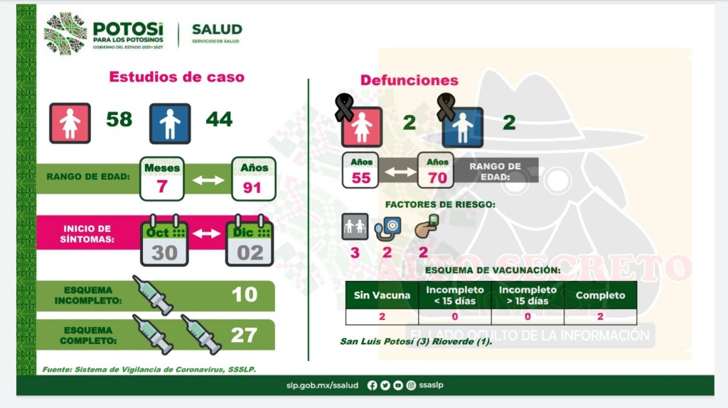 Los casos se registraron 03 y 01 deceso en Rioverde, 02 casos en Ciudad Fernández, 02 en Rayón y 01 en Alaquines.