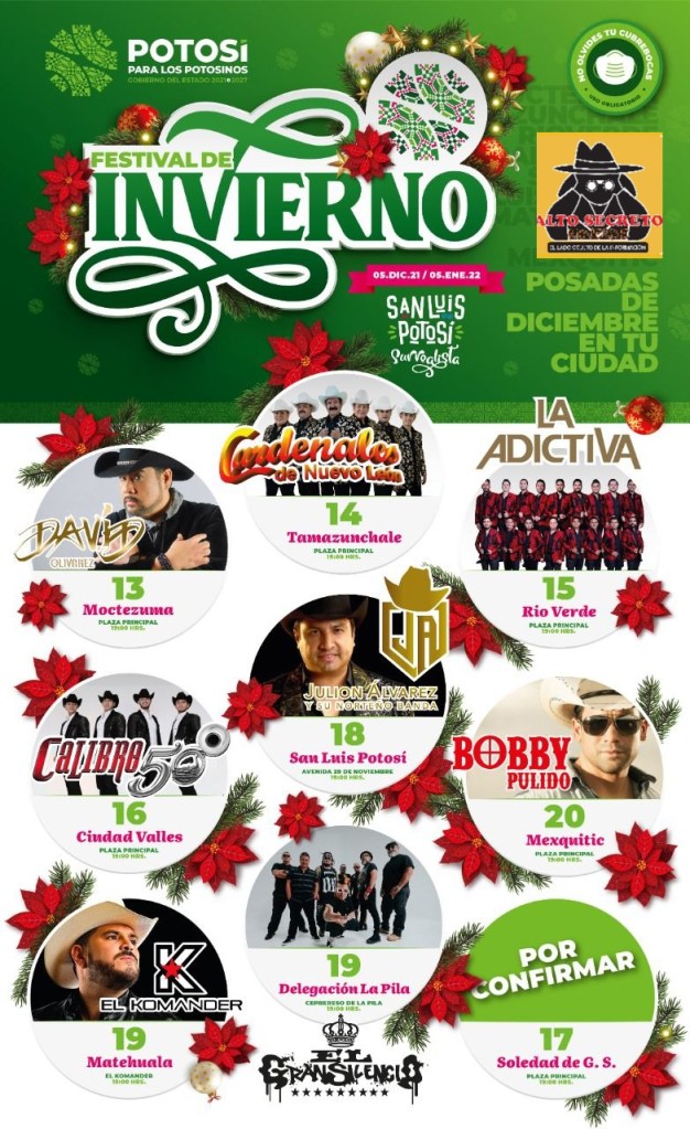 ¡Te esperamos en los municipios que albergarán la esperada programación navideña!: Moctezuma, Tamazunchale, Rioverde, Ciudad Valles, San Luis Potosí, Delegación de La Pila, Mexquitic, Matehuala y con una espectacular sorpresa musical en Soledad de Graciano Sánchez luego de que por cuestiones de agenda, Maldita Vecindad y La Sonora Santanera no asistirán a dicho evento.