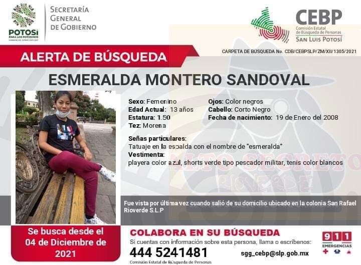 En el Municipio de Rioverde se ha emitido una alerta de búsqueda, para tratar de localizar a la menor Esmeralda Montero Sandoval, de 13 años de edad.