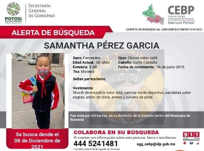 A la pequeña Samantha Pérez García se la llevó su padre ñ, sin consentimiento de su madre, ignorandose ahora en donde se encuentra.