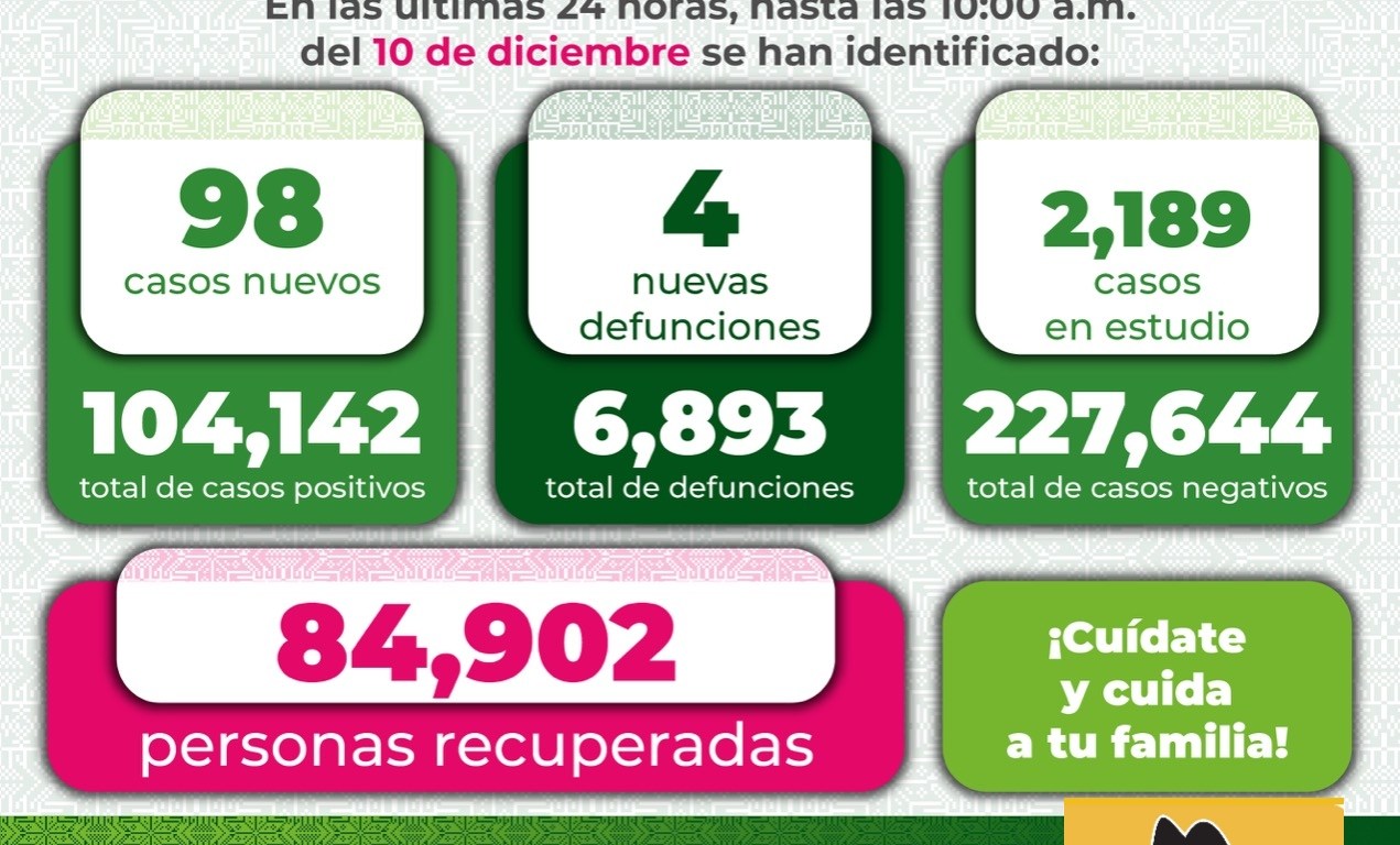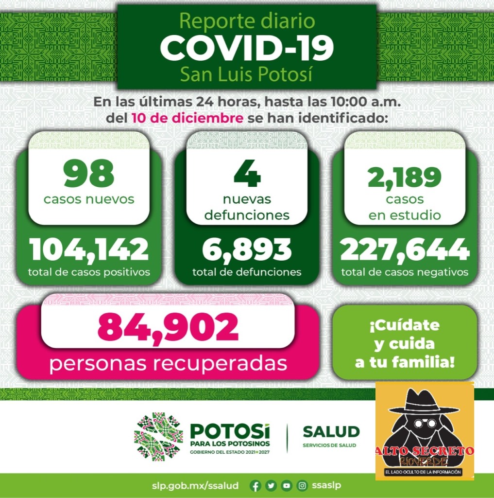 La Secretaría de Salud de San Luis Potosí y el Comité Estatal para la Seguridad en Salud, informan que, hasta este viernes 10 de diciembre se registran 104 mil 142casos totales de Covid-19, con la confirmación de98nuevos contagios en las últimas 24 horas.