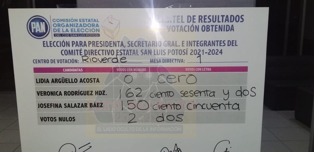 Dentro de los resultados preliminares, correspondientes al proceso de elección de la Presidenta del Comité Directivo Estatal del PAN, en lo que se refiere al Municipio de Rioverde, contra pronósticos la planilla de Verónica Rodríguez Hernández, adelantó a la de Josefina Baez Lozano, por 162 votos contra 150.