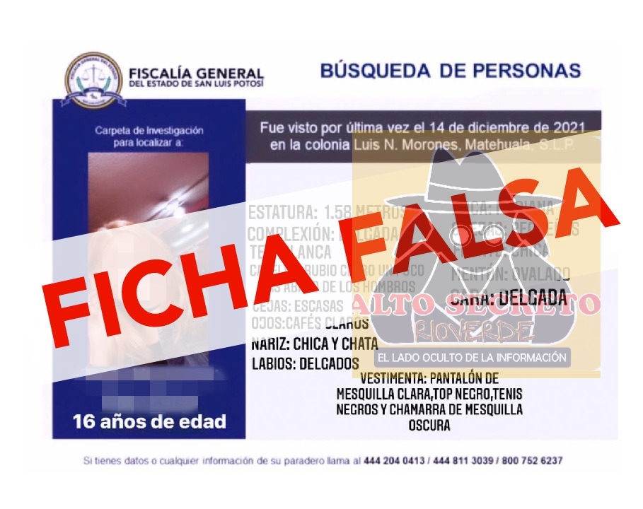Esto derivado de la detección en redes sociales de una ficha con las características similares a las oficiales, en la que se informaba sobre la supuesta desaparición de una menor de edad en el municipio de Matehuala, hecho que no es verídico y que causa un daño a quien aparece en la imagen, además de la utilización de datos privados.