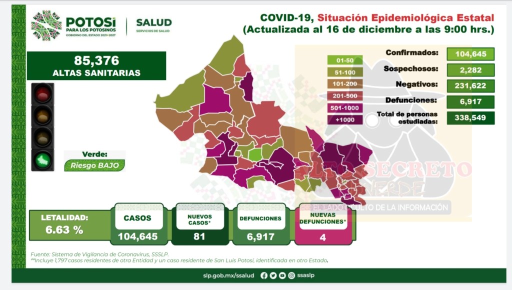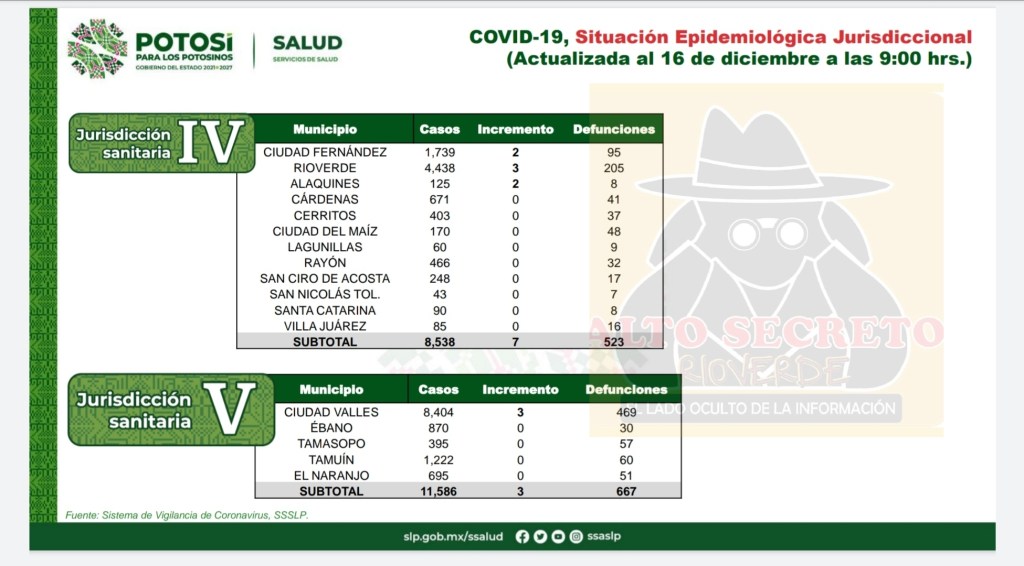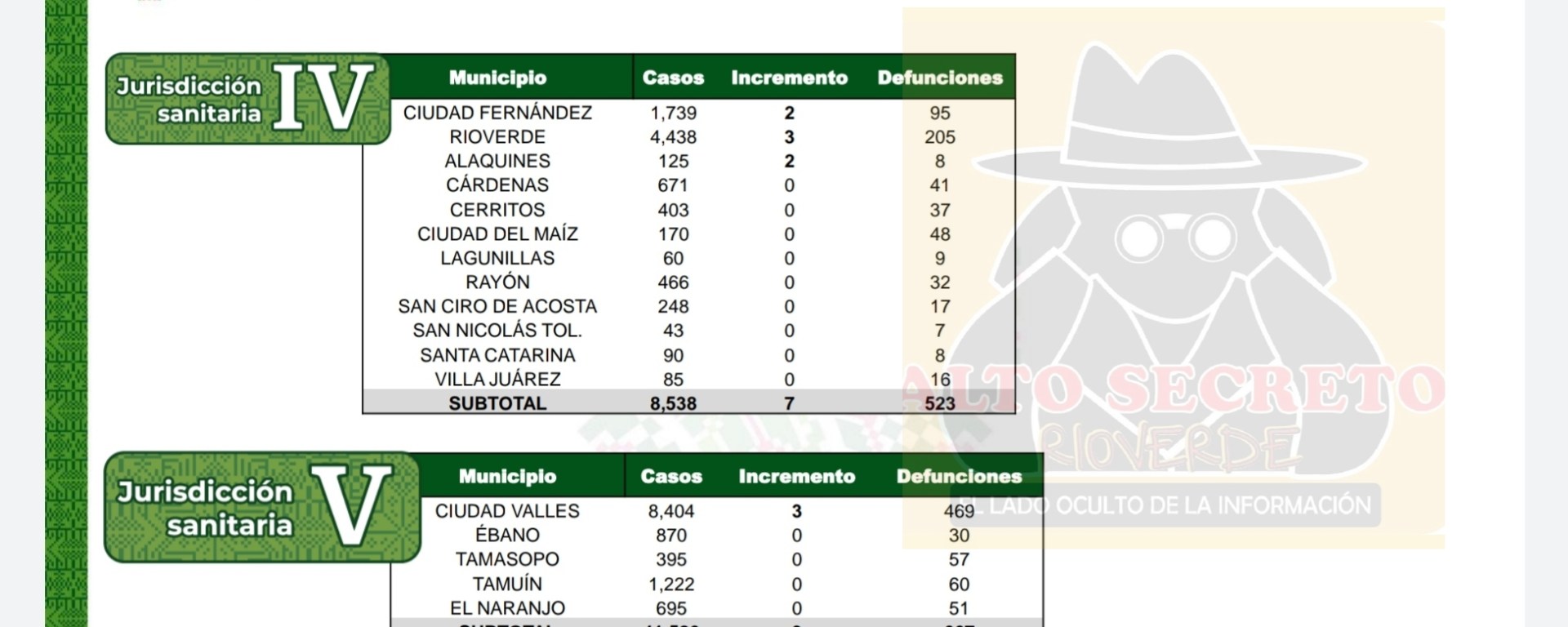 En lo que al Municipio de Rioverde se refiere, se suman 4,438 casos positivos y 205 decesos.