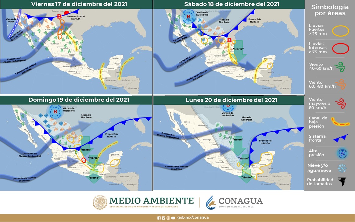 Finalmente, el frente Núm. 14 será reforzado por una masa de aire polar, mientras que un vórtice de núcleo frío y un fuerte pulso de la corriente en chorro subtropical recorrerán el noroeste y norte de la República Mexicana, mismas que provocarán: