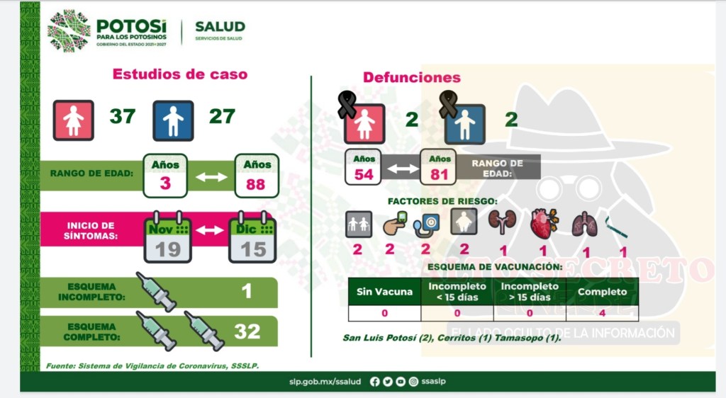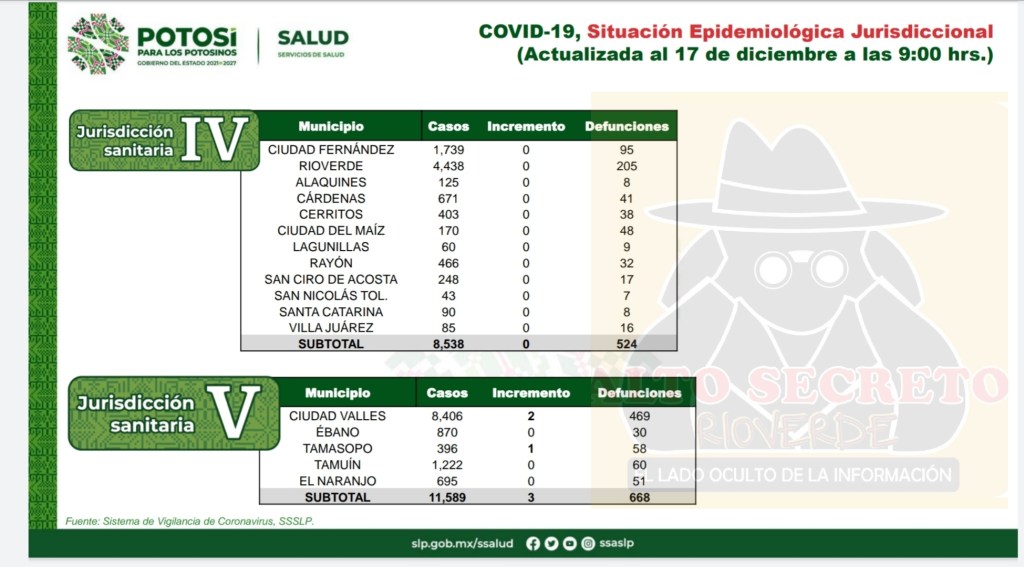 En lo que al Municipio de Rioverde se refiere se mantiene con 4,438 casos positivos y 205 defunciones.