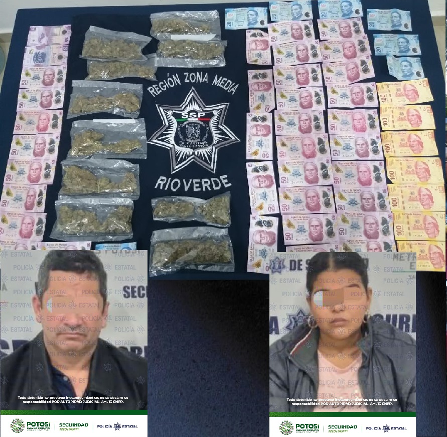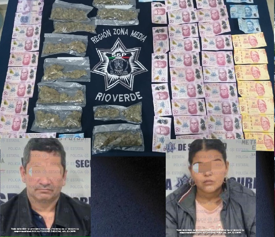 Por el presunto delito contra la salud en su modalidad de posesión de marihuana, agentes de la Policía Estatal adscritos en la Zona Media detuvieron a un hombre y una mujer en el estacionamiento de una terminal de autobuses del Bulevar Carlos Jongitud Barrios a un costado del puente Verástegui.