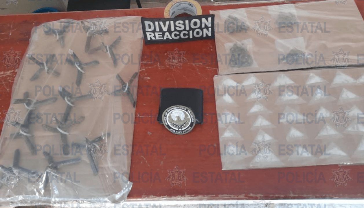 Finalmente se localizó la unidad abandonada en una brecha, detectando que en su interior había: 13 poncha llantas, 31 dosis de cristal y 25 gramos de marihuana.
