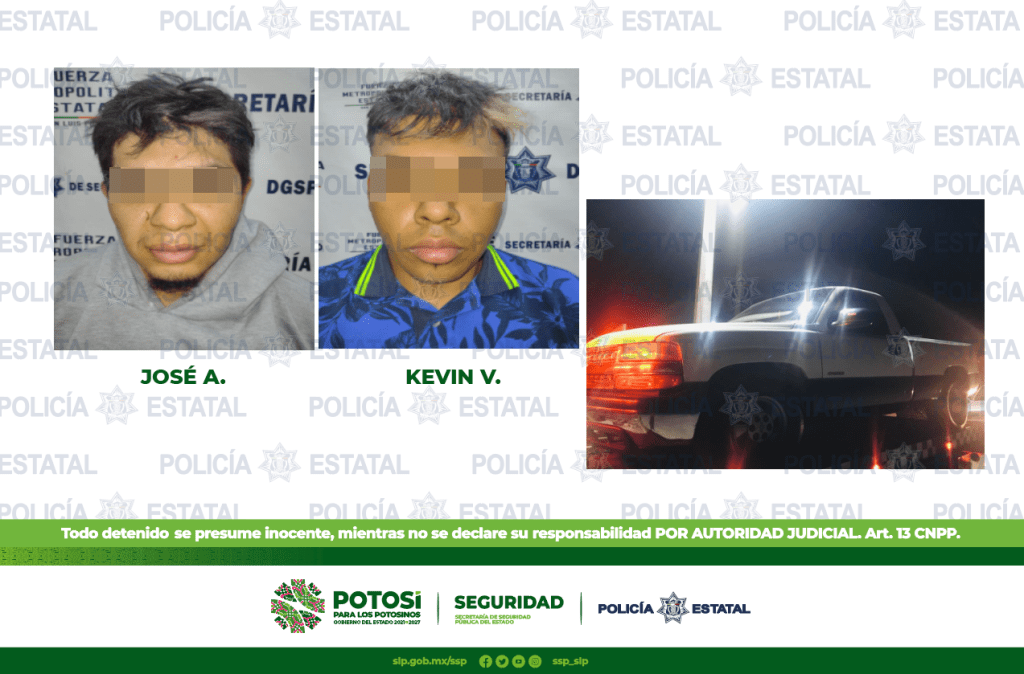 Por último, camino a Portezuelo en el municipio de Cerro de San Pedro, Policías Estatales del Grupo de Operaciones Tácticas detuvieron a José A., de 22 años de edad y a Kevin V., de 21 años de edad a quienes se les aseguró una camioneta marca Chevrolet, tipo Pick Up, color blanco, modelo 2001, de procedencia extranjera, la cual fue robada el 18 de diciembre de 2021 en la colonia Ricardo B. Anaya.