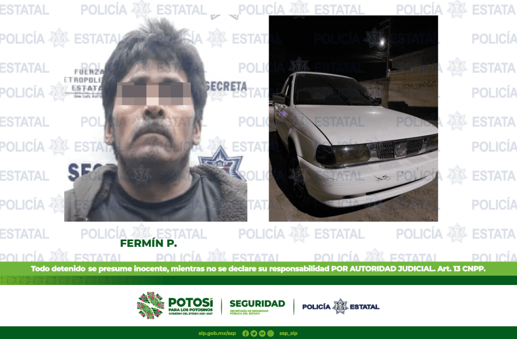 Uno de los hechos ocurrió en la calle de San Leonardo en la colonia Villas de San Francisco en Soledad de Graciano Sánchez, elementos Estatales detuvieron a Fermín P., de 49 años de edad a quien se le aseguró un automóvil marca Nissan, tipo Tsuru, color blanco, modelo 2001, sin placas el cual fue robado el día 26 de diciembre de 2021.