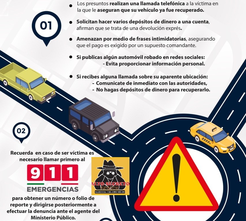 Ante esta situación, la institución de procuración de justicia recomienda que si se va publicar en torno a un automóvil robado en redes sociales se evite proporcionar información personal; si se recibe alguna llamada sobre su aparente ubicación, es importante comunicarse de inmediato con las autoridades y en ningún momento hacer depósitos de dinero para recuperarlo.