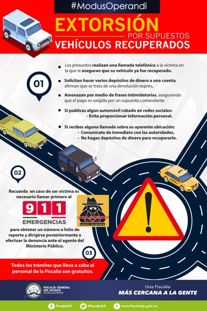 La Fiscalía General del Estado de San Luis Potosí (FGESLP) alerta a la población sobre un modus operandi utilizado para extorsionar a las personas que han sufrido el robo de su automóvil recientemente.