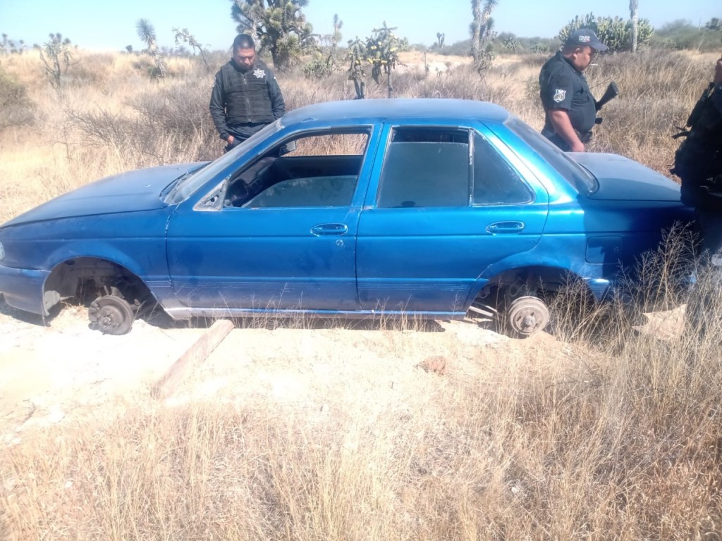 En la carretera 57 SLP-Matehuala, se llevó a cabo el aseguramiento de un automotor marca Nissan, tipo Tsuru, modelo 2002, color blanco, con placas de esta entidad sin neumáticos, el cual fue robado el día 25 de diciembre de 2021, de la zona Centro de Soledad de Graciano Sánchez.
