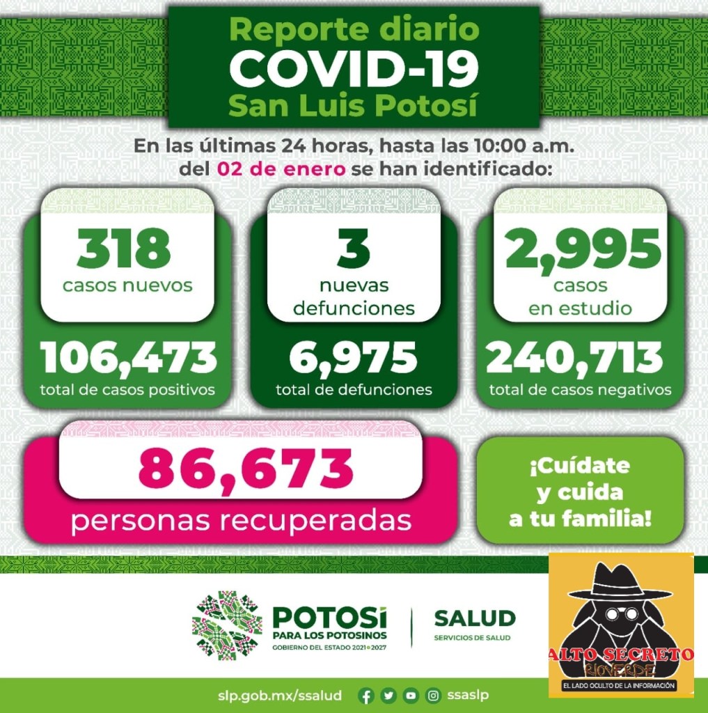 Los Servicios de Salud y el Comité Estatal para la Seguridad en Salud, informan que, hasta este domingo 2 de enero se registran 105 mil 473 casos totales de Covid-19, con la confirmación de 318 nuevos contagios de acuerdo al reporte epidemiológico de las últimas 24 horas.