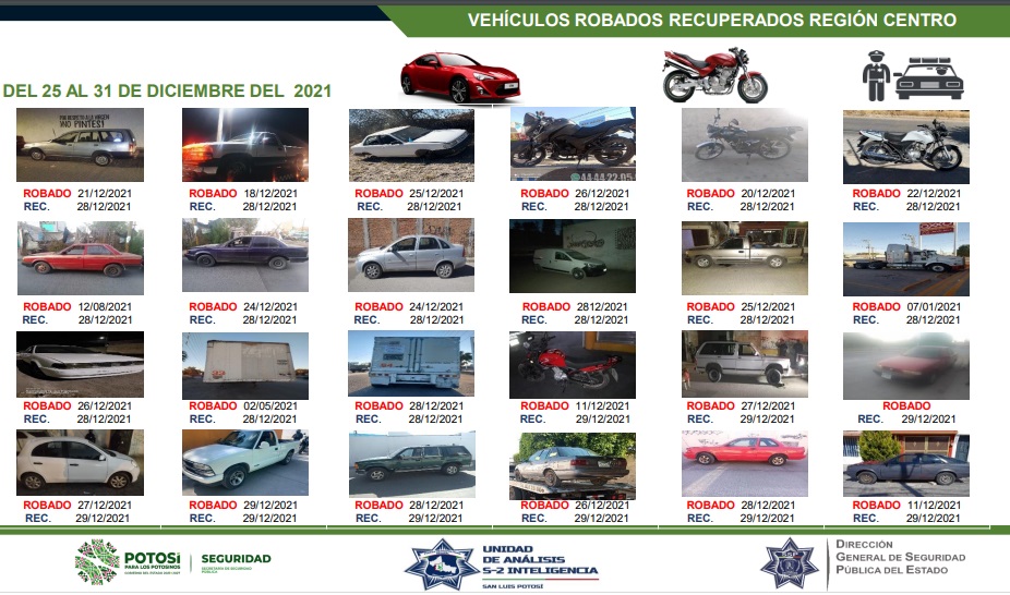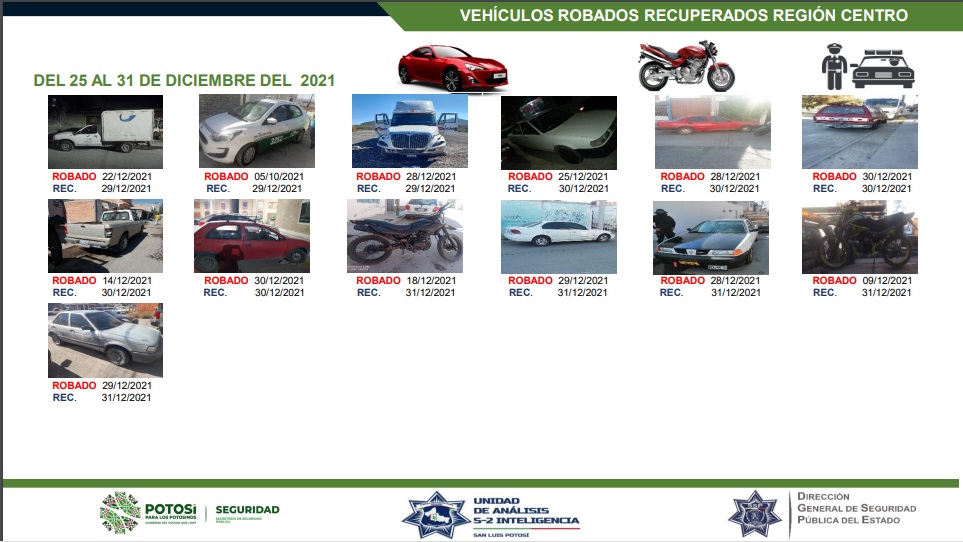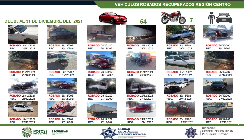 Fueron en total 54 vehículos y 07 motocicletas localizadas entre la región Centro y Altiplano del estado, donde gracias a la coordinación de elementos Estatales y el Centro de Coordinación, Control, Comando, Comunicación, Cómputo, Información e Inteligencia (C5i2) se llevó a cabo la recuperación de las unidades, mediante acciones de videovigilancia y patrullajes.