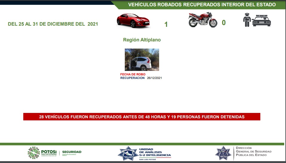 Derivado de los operativos y de las acciones de seguridad y vigilancia que lleva a cabo la Secretaría de Seguridad Pública del Estado (SSPE) para inhibir los delitos patrimoniales que aquejan a la ciudadanía, del 24 al 31 de diciembre de 2021, se aseguraron 62 unidades con reporte de robo, 26 de estas, dentro de las primeras 48 horas después de haber recibido la denuncia correspondiente.