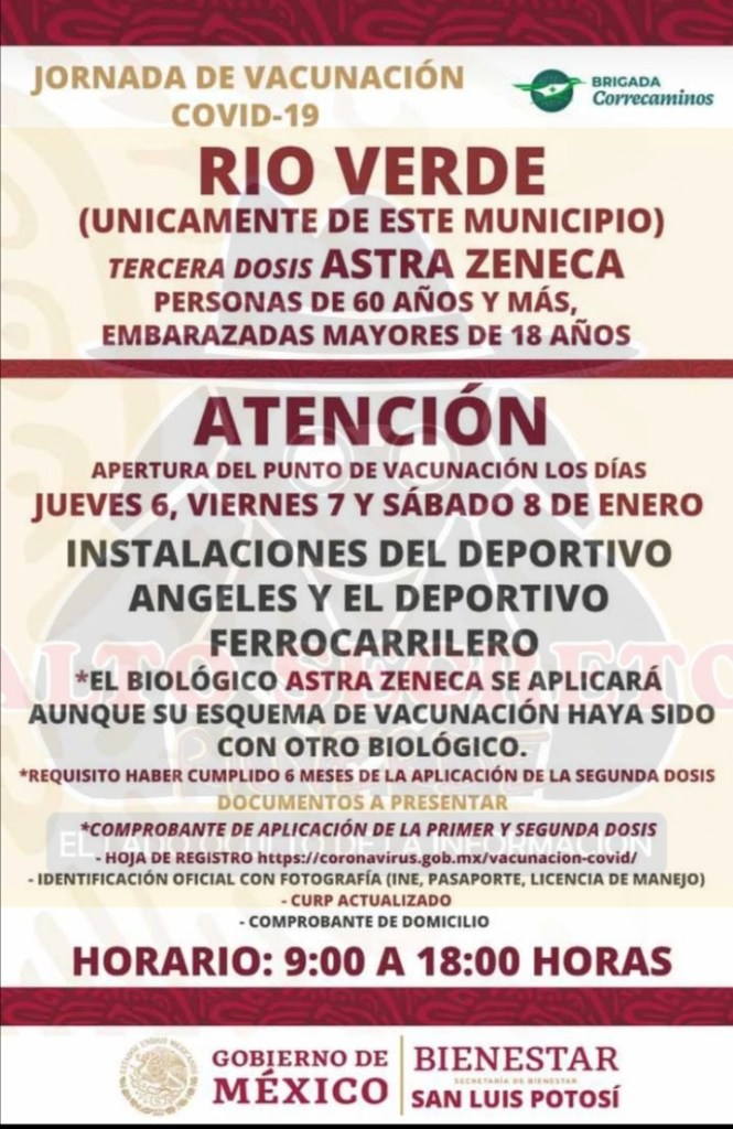 En el Municipio de Rioverde, se estará aplicando la tercera dosis de vacuna contra el Covid19 Astra Zeneca, durante los días jueves 06, viernes 07 y sábado 08 del presente mes de Enero, para personas de 60 años y más y mujeres embarazadas mayores de 18 años.