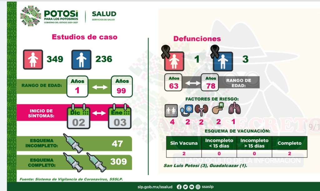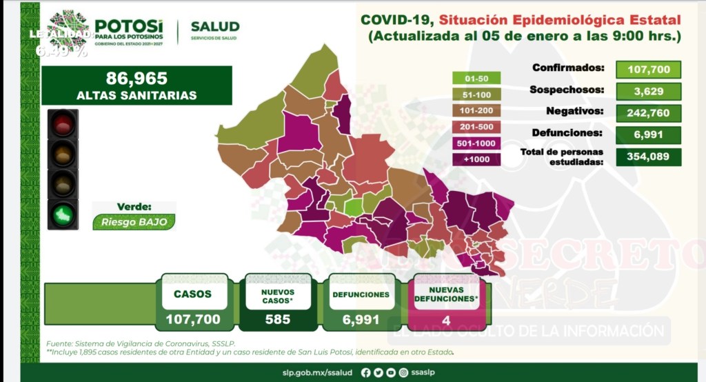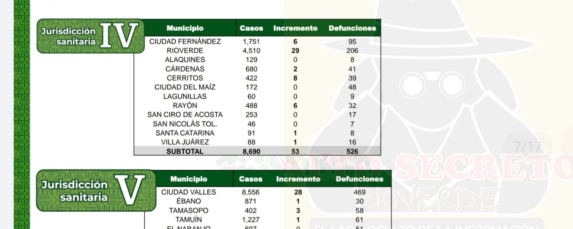 En el Municipio de Rioverde suman ya 4,510 casos positivos y 206 decesos, mientras que en Ciudad Fernández suman ya 1,751 casos positivos y 95 decesos.