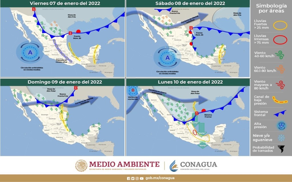 Ø La masa de aire polar que impulsará al nuevo frente provocará fuerte descenso de las temperaturas y vientos fuertes con tolvaneras sobre entidades del norte, noreste y oriente del país.