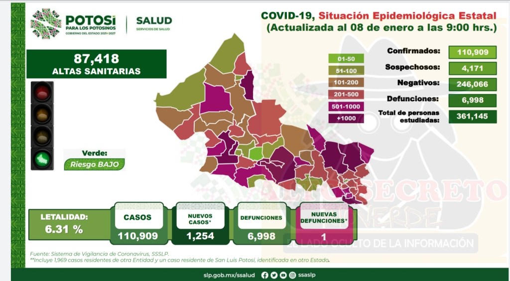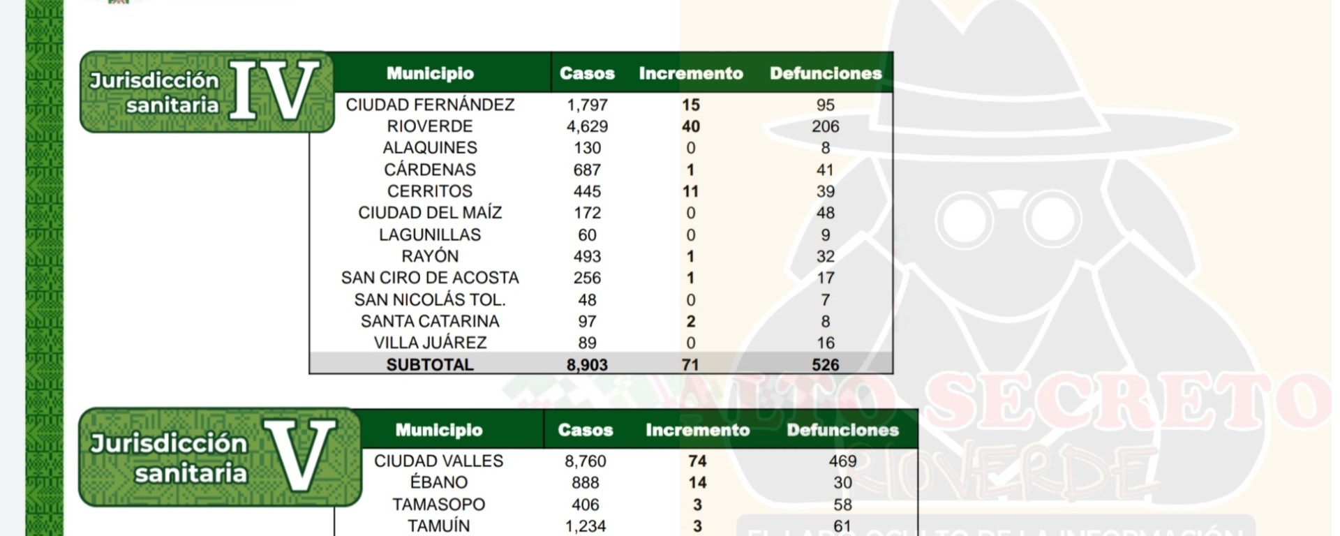 En lo que al municipio de Rioverde se refiere, se suman ya 4,629 casos positivos y 206 decesos, mientras que en Ciudad Fernández se acumulan 1,797 casos positivos y 95 decesos.