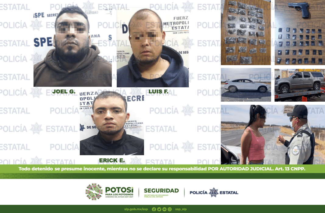 Luego de participar en un robo con violencia de un vehículo en Periférico Norte y Camino a Peñasco al norte de la ciudad, agentes de la Policía Estatal lograron la captura de tres presuntos responsables quienes traían droga así como una pistola de utilería; dentro de este hecho también se logró ubicar la unidad en el Municipio de Salinas de Hidalgo en cuyo interior viajaban dos personas.
