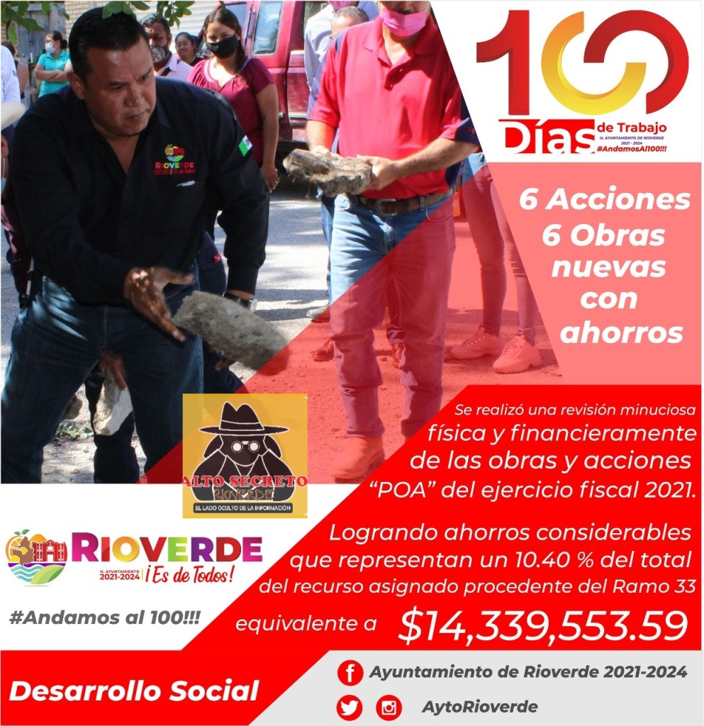 En estos cien días de arduo trabajo, por instrucciones del Alcalde de Rioverde Arnulfo Urbiola Román, en la Coordinación de Desarrollo Social lograron ahorros importantes que ascendieron a 14 Millones 339 mil 553 pesos con 59 centavos del total del recurso asignado procedente del ramo 33, concretándose 6 nuevas obras y 6 nuevas acciones para beneficio de la ciudadanía.