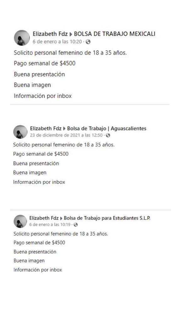 Es un perfil falso o previamente hackeado y que aparece con el nombre de Elizabeth Fdz, desde donde se reclutan a jóvenes para supuestos trabajos de mesera y edecán erótica, para servicios exclusivo de clientes solventes.
