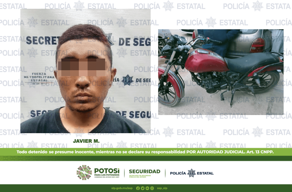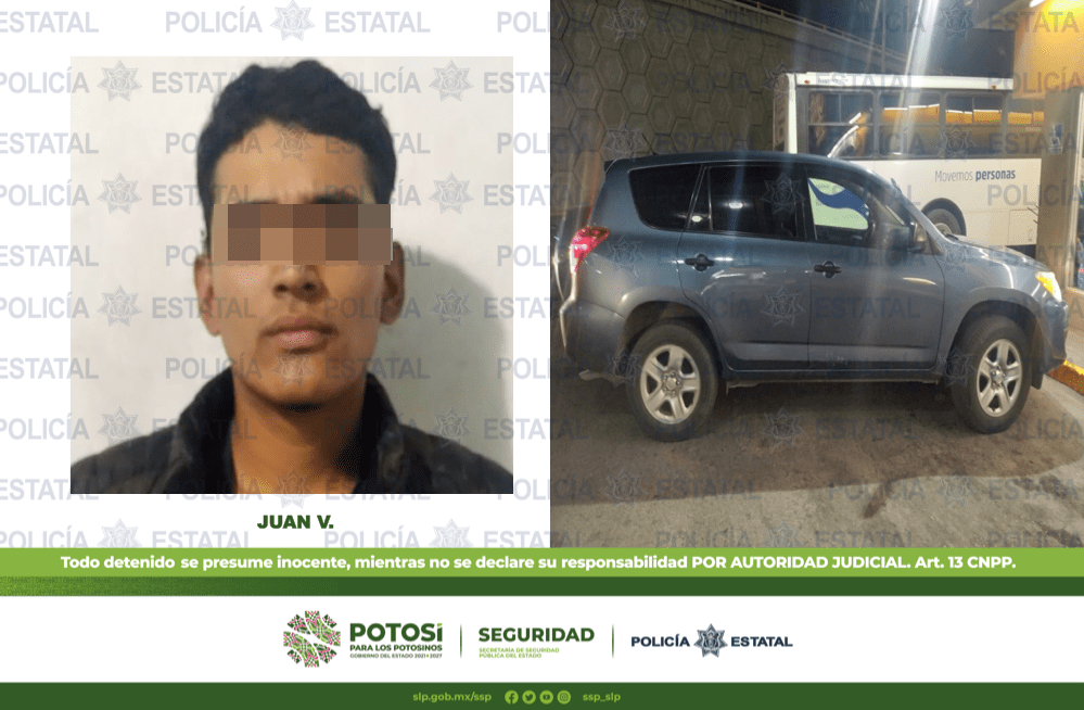 La primera detención fue en Periférico y carretera a Zacatecas, en la colonia Los Salazares, donde los elementos Estatales detuvieron a Juan V., de 21 años de edad, a quien le aseguraron una camioneta marca Toyota, tipo Ram, modelo 2009, color azul, la cual fue robada el 09 de enero de 2022, en la colonia 21 de Marzo en el municipio de Soledad de Graciano Sánchez.