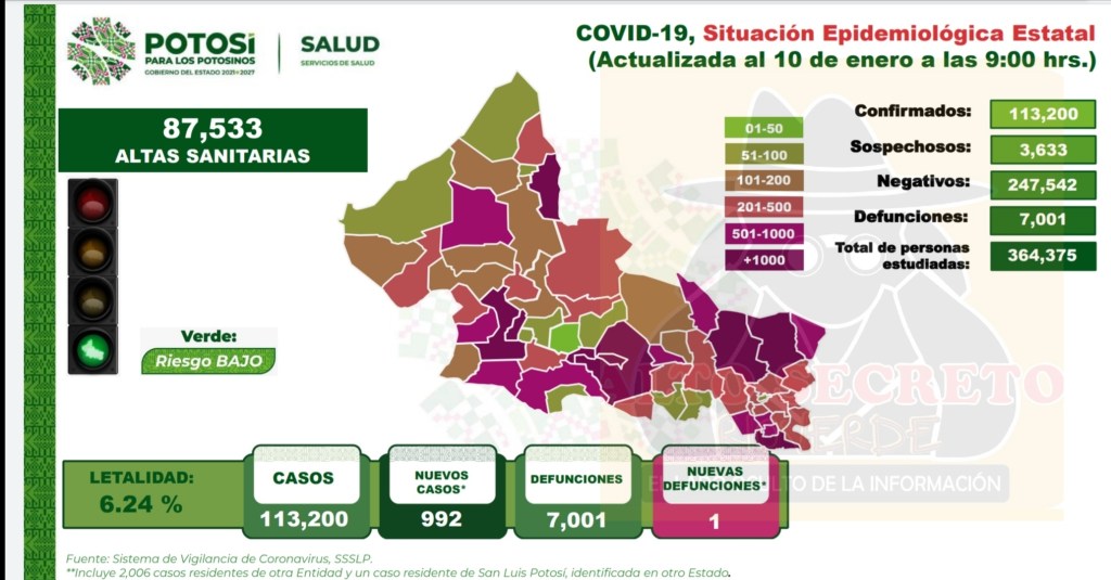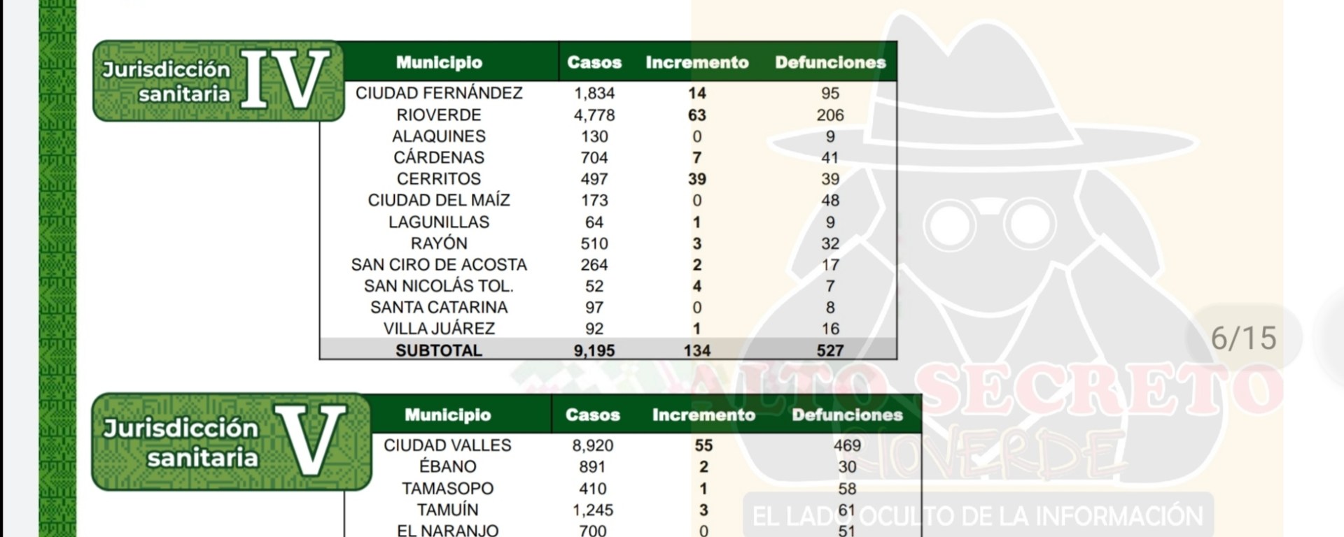 En lo que al Municipio de Rioverde se refiere, suman ya 4,778 casos positivos y 206 decesos, mientras que en Ciudad Fernández se acumulan 1,834 casos positivos y 95 decesos.