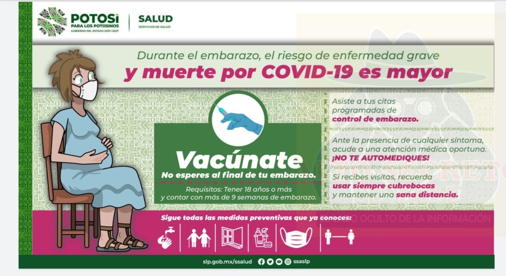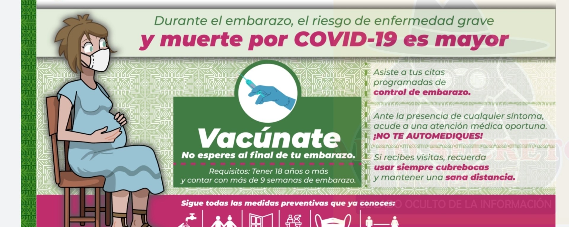 Los Servicios de Salud y el Comité Estatal para la Seguridad en Salud, convocan a las mujeres embarazadas a aplicarse la vacuna correspondiente contra el Covid-19, ya que al igual que los menores de edad de cinco años y las personas adultas mayores y las que cursan alguna comorbilidad, tienen mayor riesgo de contraer el virus y enfermar de gravedad, inclusive, morir.