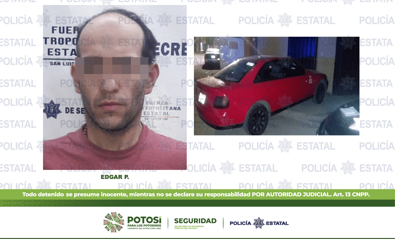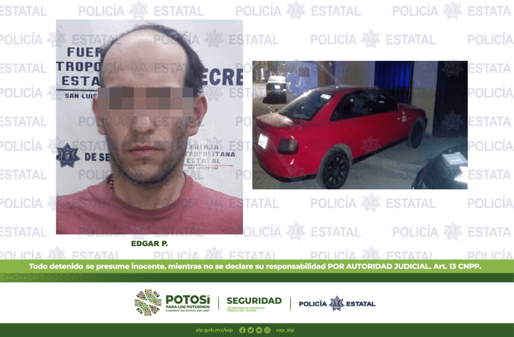 La primera detención fue en las calles de Amatista y Diamante, en la colonia Valle Dorado, donde agentes Estatales detuvieron a Edgar P., de 32 años de edad, al asegurarle un Audi, tipo A-4, color rojo, modelo 2001, el cual fue robado la madrugada del 20 de enero de 2022, en la colonia Dalias del Llano.
