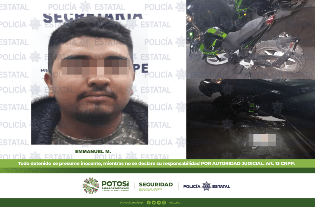 En la carretera federal 49 del municipio de Mexquitic de Carmona, Policías Estatales detuvieron a Emmanuel M., de 20 años de edad, a quien le aseguraron una motocicleta Italika, modelo 2018, color verde, reportada como robada el 19 de enero de 2022. También se le aseguró otra motocicleta modelo 2021, color verde de su propiedad.