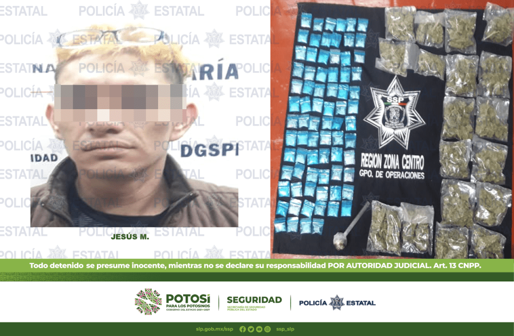 Fue sobre la calle Leonardo Da Vinci y Avenida Salk, donde los agentes Estatales detuvieron a Jesús M., de 29 años de edad, después de asegurarle un total de 76 dosis de la droga sintética conocida como “cristal”, así como 18 bolsas que contenían una hierba verde y seca con las propiedades físicas de la marihuana.