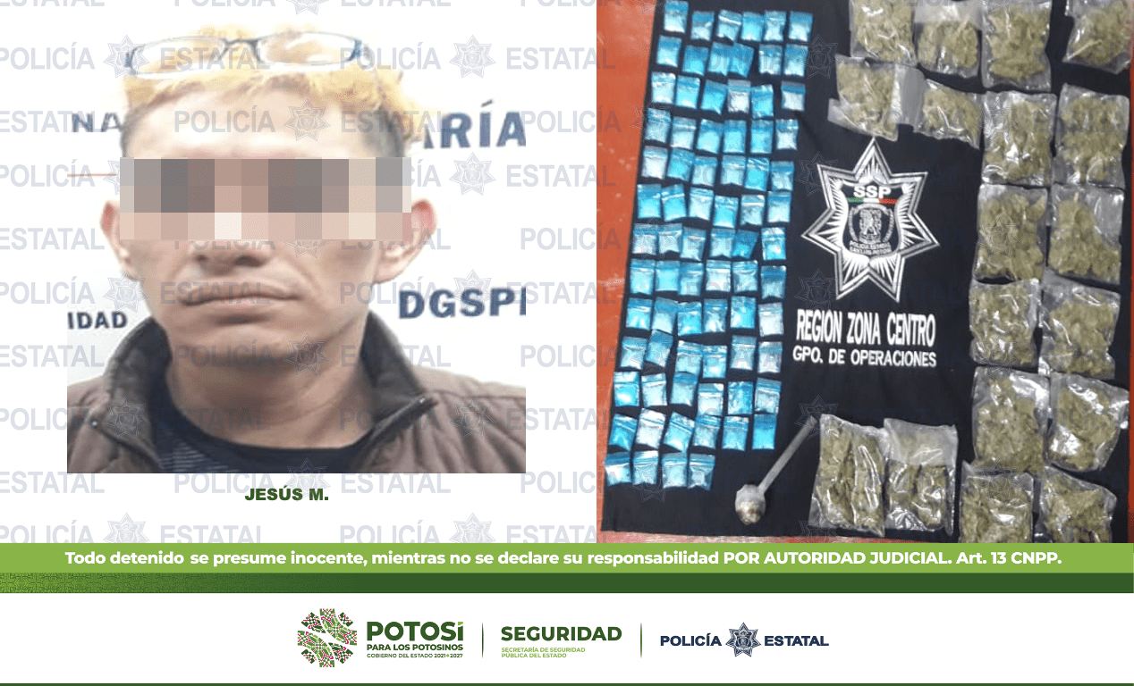 Fue sobre la calle Leonardo Da Vinci y Avenida Salk, donde los agentes Estatales detuvieron a Jesús M., de 29 años de edad, después de asegurarle un total de 76 dosis de la droga sintética conocida como “cristal”, así como 18 bolsas que contenían una hierba verde y seca con las propiedades físicas de la marihuana.