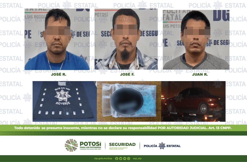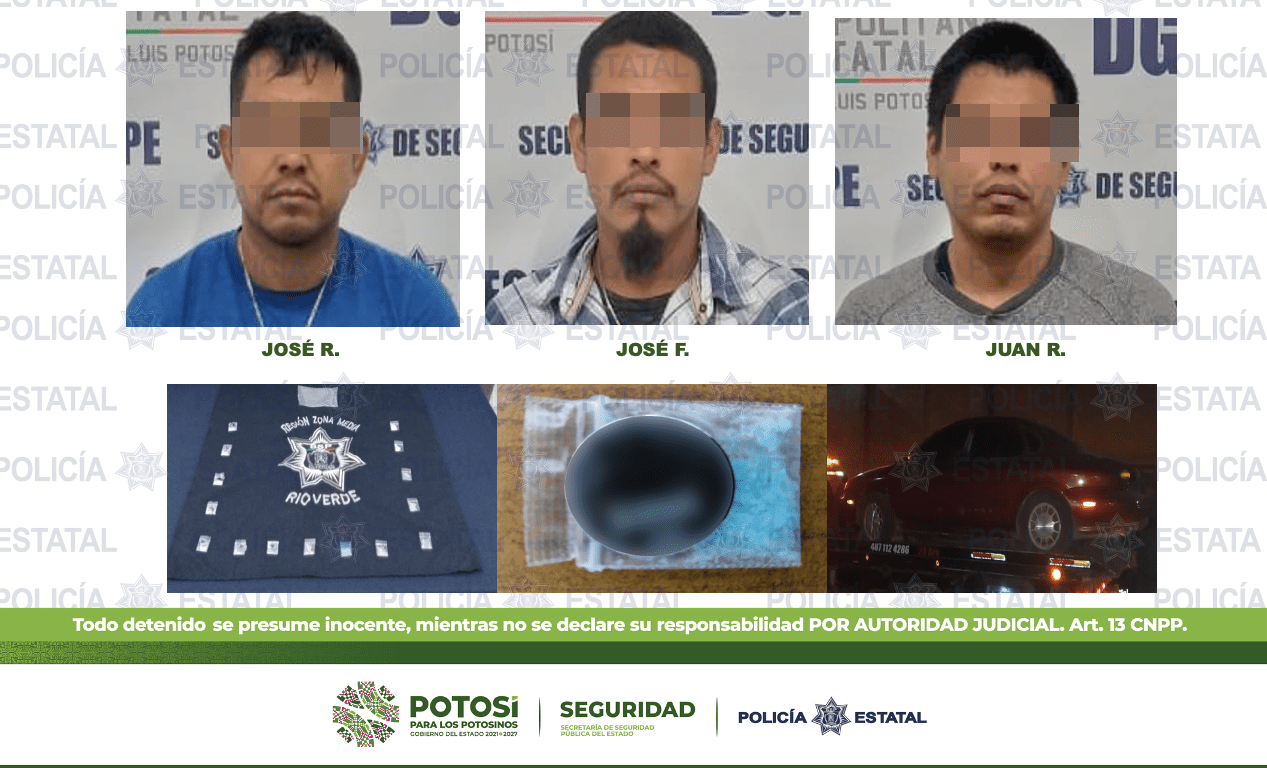 En la calle Alameda en la zona Centro, agentes Estatales detuvieron a José R., de 31 años de edad, José F., de 28 años de edad y a Juan R., de 26 años de edad, a quienes se les aseguraron 15 dosis de “cristal”, así como un vehículo marca Ford, tipo Taurus, modelo 1996, color rojo, con placas del estado de Texas.