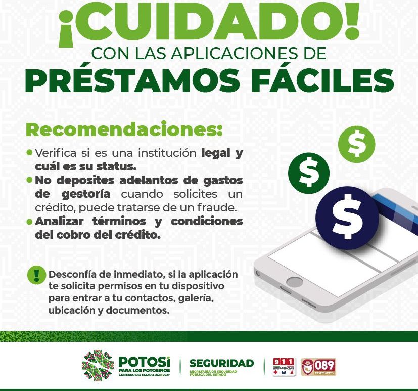 POLICÍA CIBERNÉTICA DE LA SSPE ALERTA POR APLICACIONES DE PRÉSTAMOS ECONÓMICOS FÁCILES La Policía Cibernética de la Secretaría de Seguridad Pública del Estado, exhorta a la ciudadanía a ser cautelosos con el uso de aplicaciones de préstamos económicos fáciles, en razón de ser un problema que cada vez es más frecuente en San Luis Potosí. En este sentido, se han brindado asesorías luego de varios … Continúa leyendo ALERTAN CONTRA APLICACIONES DE PRÉSTAMOS ECONÓMICOS