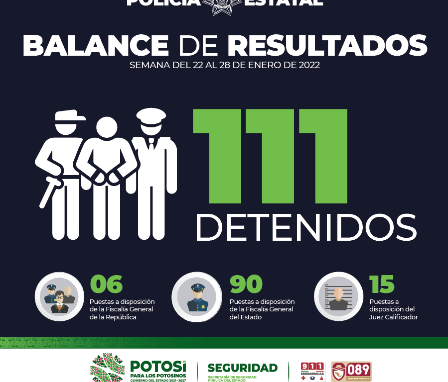 De acuerdo con un balance de resultados emitido por la Secretaría de Seguridad Pública del Estado, en el periodo comprendido del 22 al 28 de enero del año en curso, en San Luis Potosí se registró la detención de un total 111 personas, 6 de ellas quedaron a disposición de la Fiscalía General de la República; 90 ante la Fiscalía General del Estado y 15 más fueron presentadas ante el Juez Cívico Calificador por faltas administrativas.