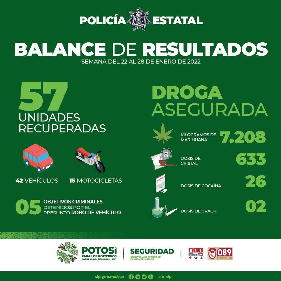 BALANCE SEMANAL DE RESULTADOS DE LA POLICÍA ESTATAL DEL 22 AL 28 DE ENERO
