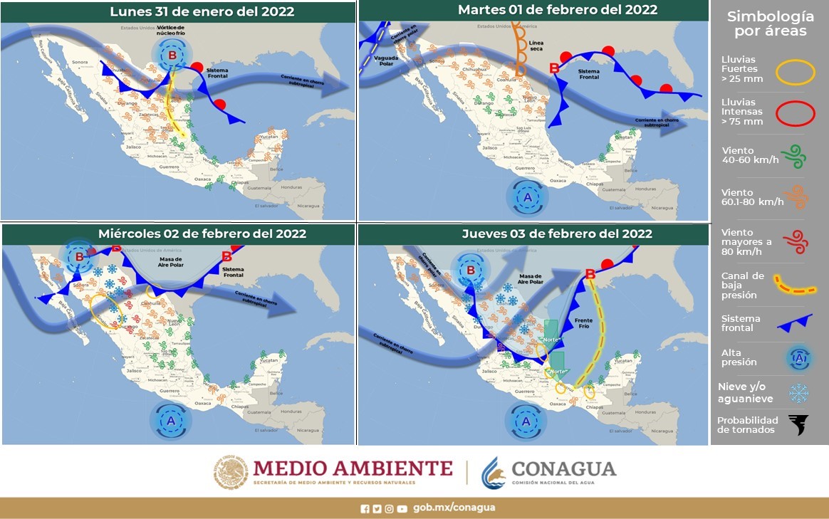 A partir de la tarde del martes, un nuevo frente frío y su masa de aire polar en interacción con una vaguada polar y un pulso de la corriente en chorro subtropical podrían dar origen a una tormenta invernal, provocando ambiente muy frío, lluvias y vientos fuertes con tolvaneras sobre el noroeste y norte del territorio nacional, así como caída de nieve y aguanieve en las sierras de Sonora, Chihuahua y Durango, condiciones que se extenderán durante la madrugada del jueves al noreste del país, con posible caída de nieve y aguanieve en las sierras de Coahuila y Nuevo León.