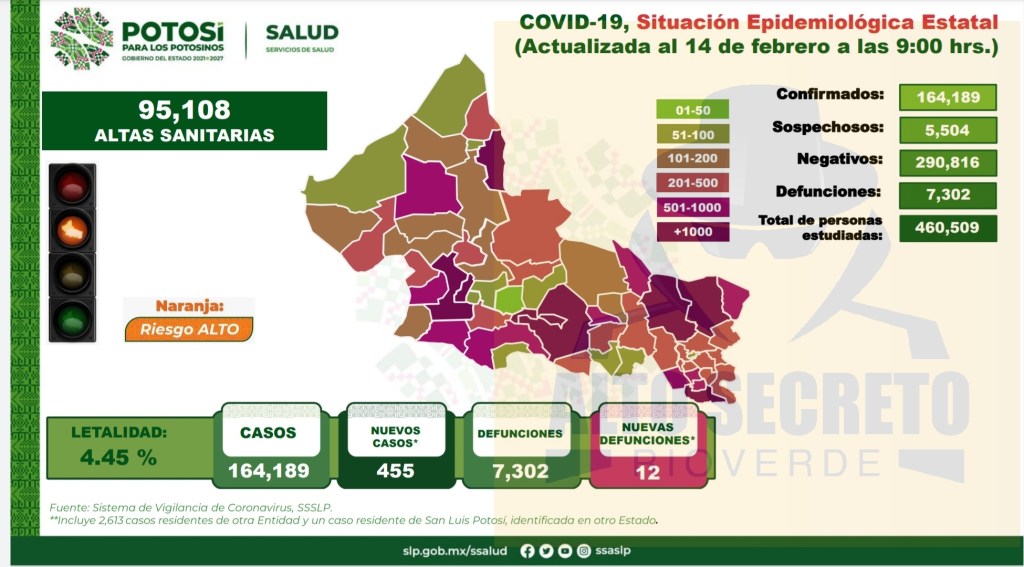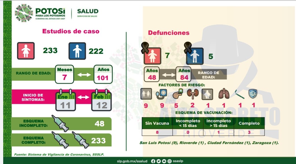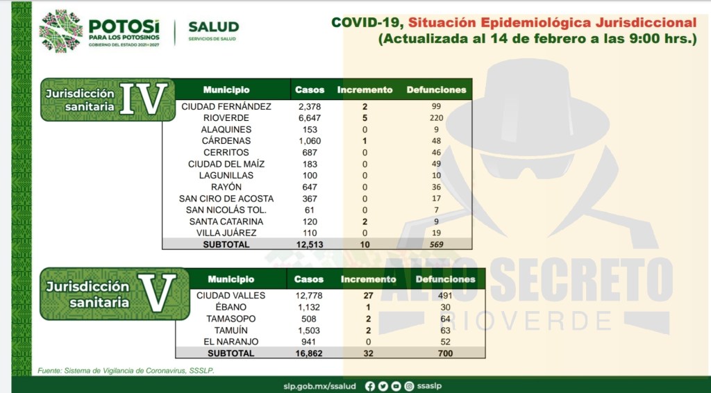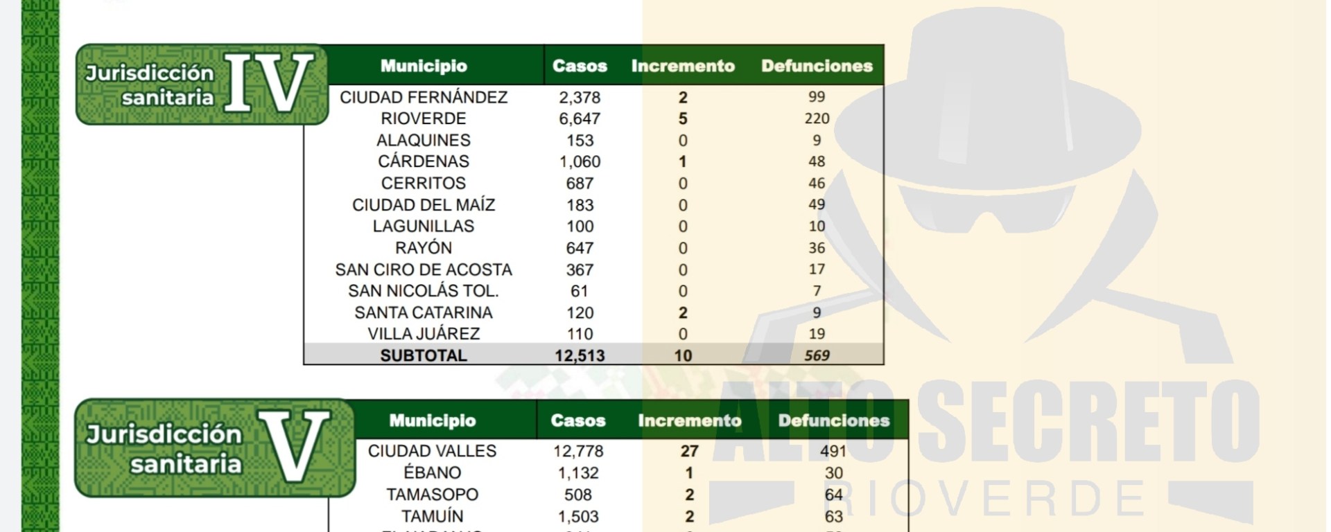 En lo que se refiere al Municipio de Rioverde, suman ya 6,647 casos positivos y 220 decesos, mientras que en Ciudad Fernández se acumulan 2,378 casos positivos y 99 decesos.
