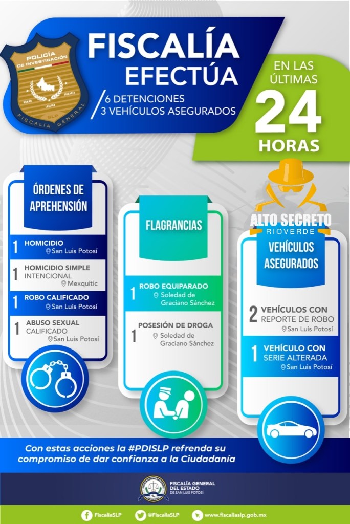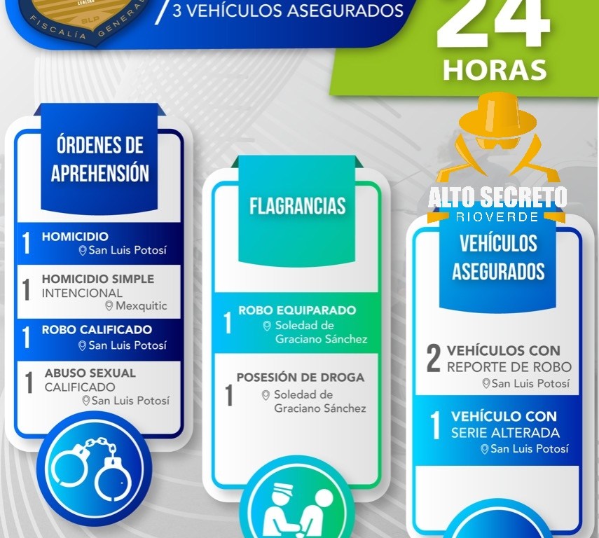 Dentro de los mandamientos judiciales destacan: un menor de edad detenido por el delito de homicidio en La Pila, San Luis Potosí; un hombre por homicidio simple intencional en Mexquitic de Carmona; un individuo por abuso sexual calificado en la ciudad Capital.