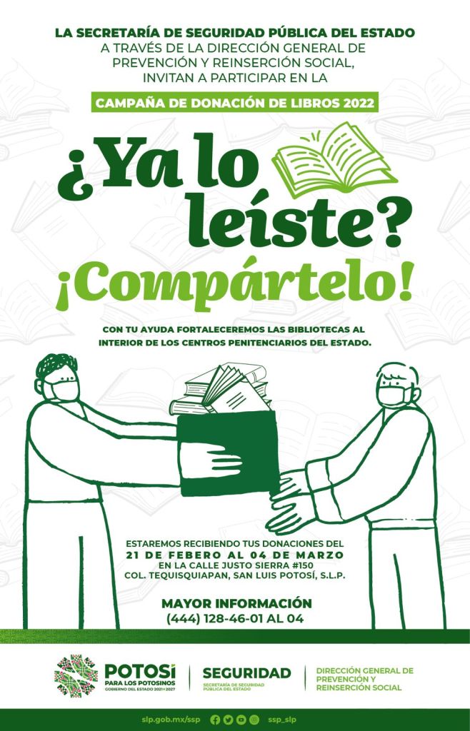 La Secretaría de Seguridad Pública del Estado través de la Dirección de Prevención y Reinserción Social, invita a la sociedad en general a sumarse a la campaña de donación de libros denominada “¿Ya lo leíste? ¡Compártelo!”.