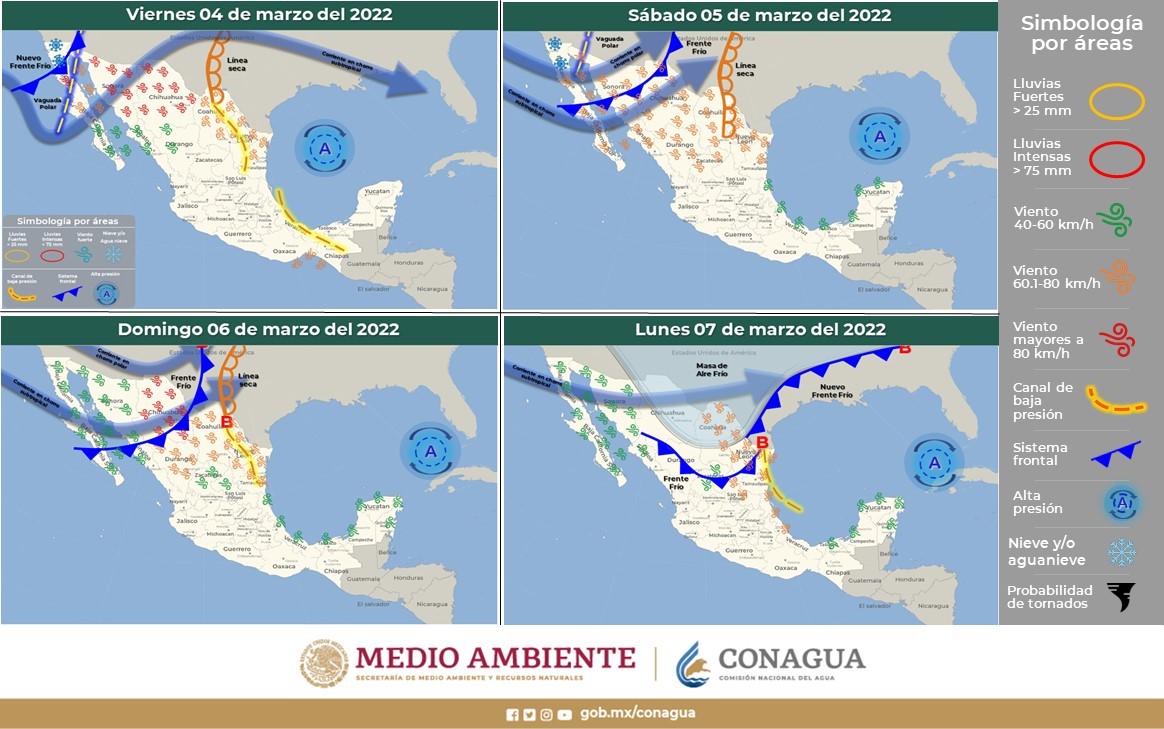 El nuevo frente frío durante sábado y domingo recorrerá el noroeste y norte de la República Mexicana y en interacción con una vaguada polar, ocasionará descenso de temperatura y vientos fuertes a muy fuertes con tolvaneras sobre dichas regiones, así como lluvias dispersas en Baja California y probabilidad para la caída de nieve o aguanieve en las sierras de dicha entidad. A partir del lunes, la vaguada polar se moverá hacia el centro de Estados Unidos, dejando de afectar al territorio nacional, mientras que el frente frío y su masa de aire asociada, se desplazarán sobre el noreste y oriente del territorio nacional, originando vientos fuertes y chubascos con descargas eléctricas en dichas regiones, así como evento de “Norte” con rachas de 50 a 70 km/h en el litoral de Tamaulipas y Veracruz.